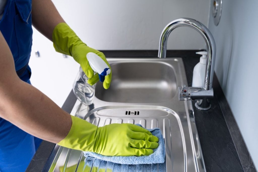 Comece misturando partes iguais de vinagre branco e água em um frasco de spray. Aplique essa solução generosamente sobre a pia e, em seguida, polvilhe bicarbonato de sódio sobre as áreas mais afetadas.