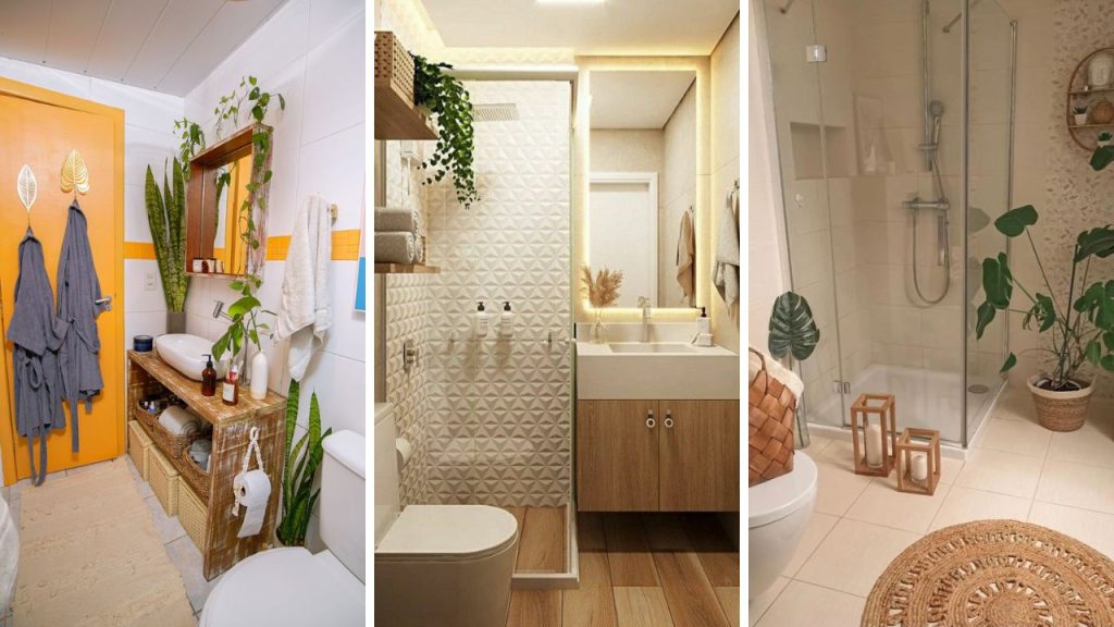 Banheiros pequenos podem ganhar vida com cores vibrantes como laranja, amarelo ou verde, combinadas com elementos naturais.