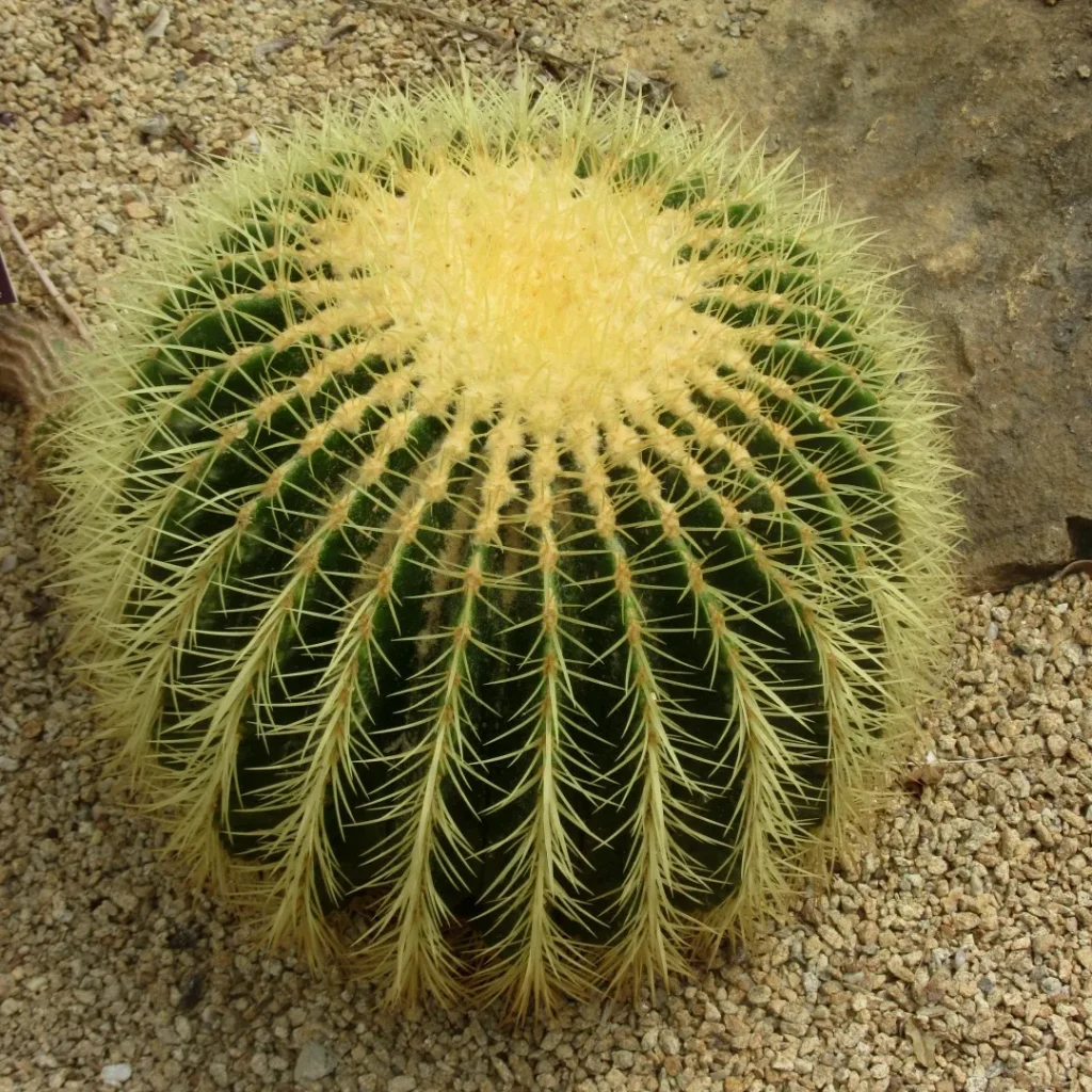 O cacto poltrona-de-sogra, também conhecido como Echinocactus grusonii, é uma planta de origem mexicana extremamente popular na jardinagem. Sua aparência redonda e achatada no topo lembra um pufe de assento, com espinhos amarelos e pontiagudos que podem atingir até 5 centímetros.