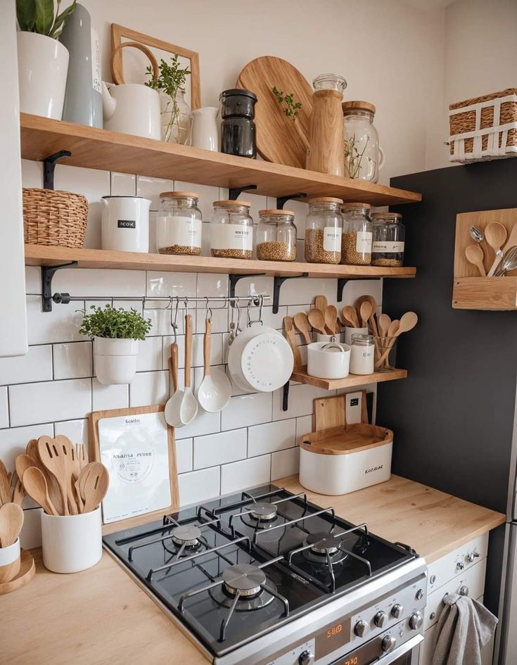 Para aplicar essa combinação, você pode pintar as paredes de branco e optar por móveis de madeira, como mesas, cadeiras e estantes. Além disso, detalhes em madeira como molduras, prateleiras e até utensílios de cozinha podem ajudar a compor essa estética.