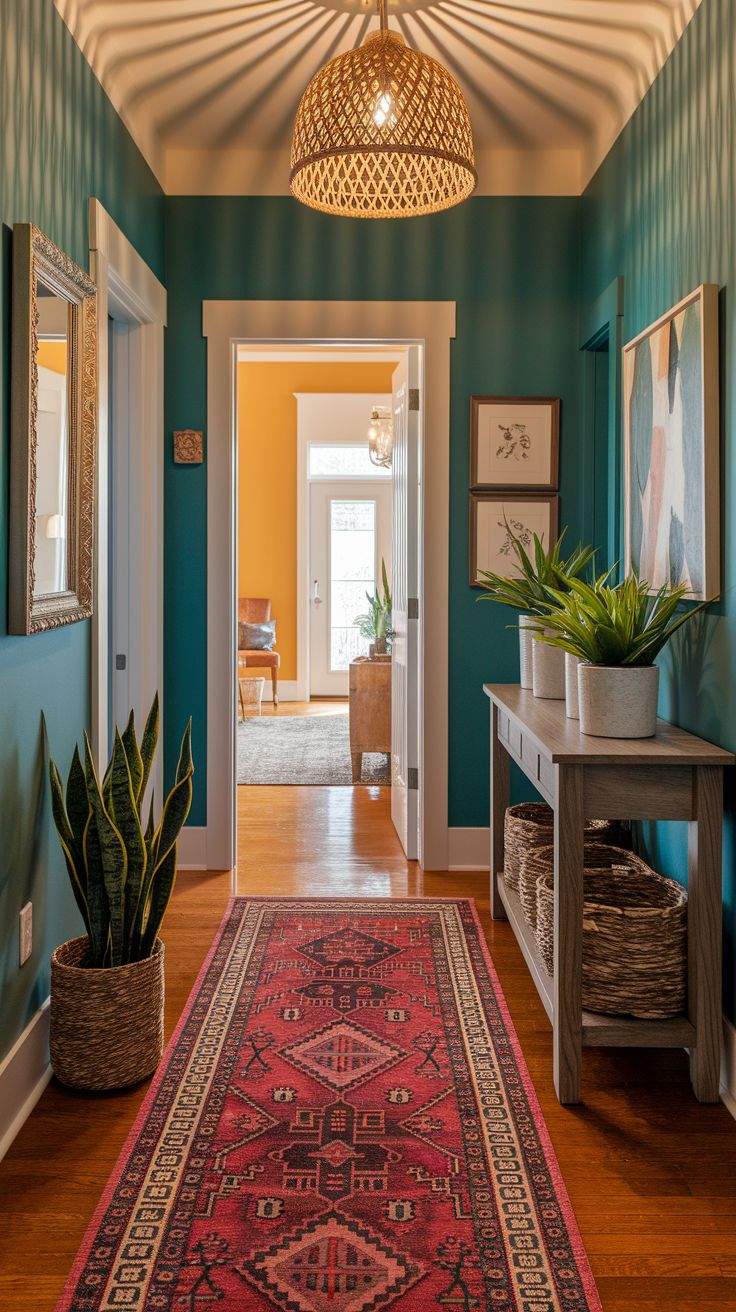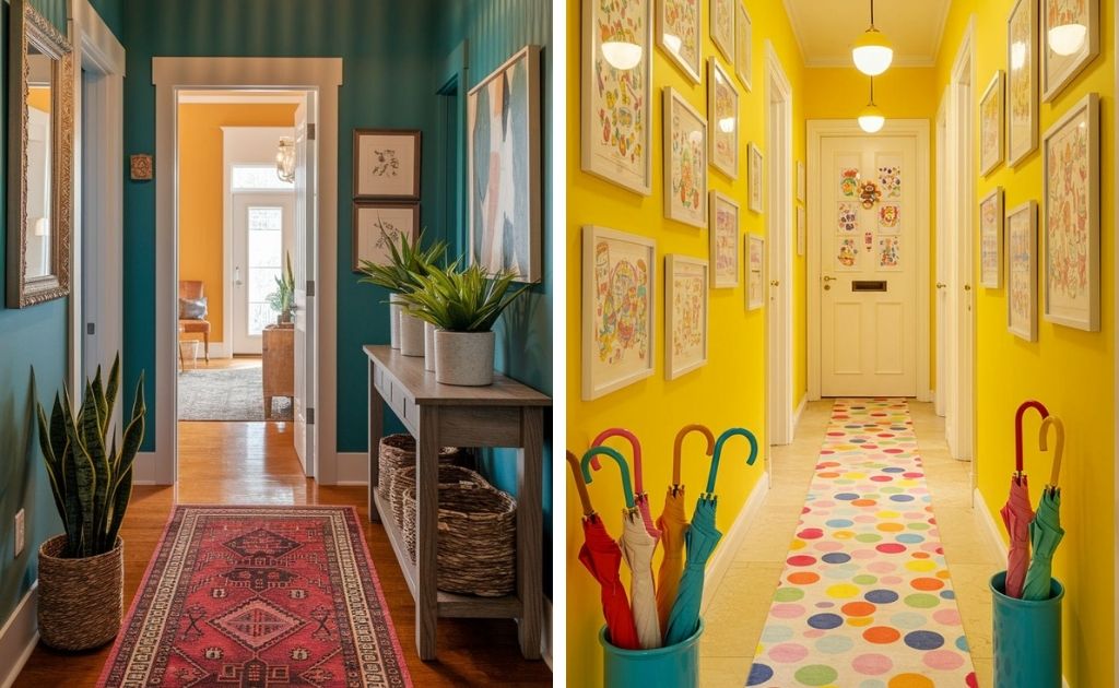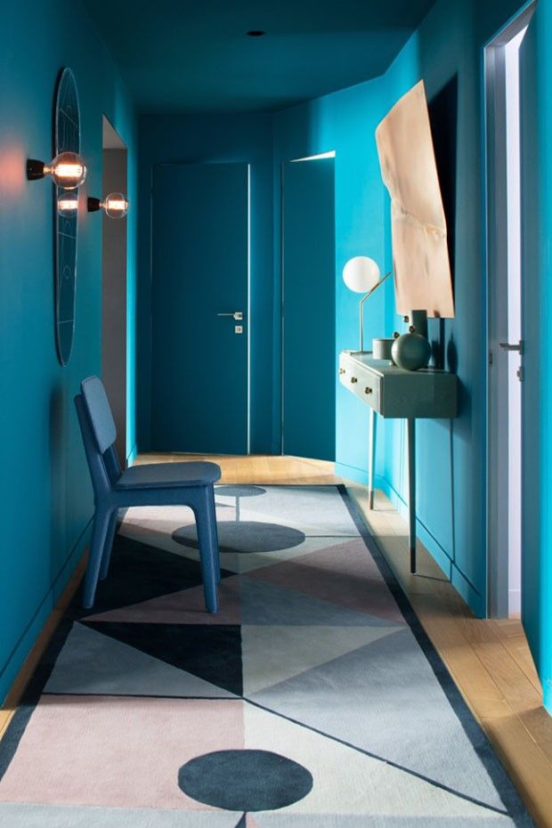 Se você tem um corredor longo e sem graça, experimente dar aquele toque de cor. Pode ser uma parede só (bem ousada!) ou até mesmo as portas. Um tom vibrante, como um azul-turquesa, amarelo mostarda ou verde esmeralda, vai transformar totalmente o ambiente.