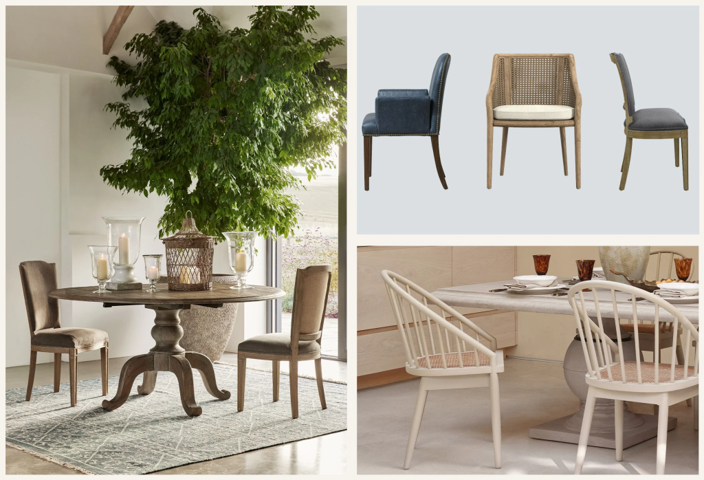 Cadeiras com design diferenciado, como braços ou encostos altos nas extremidades de mesas retangulares, ou ovais, podem servir como pontos focais na configuração do espaço.