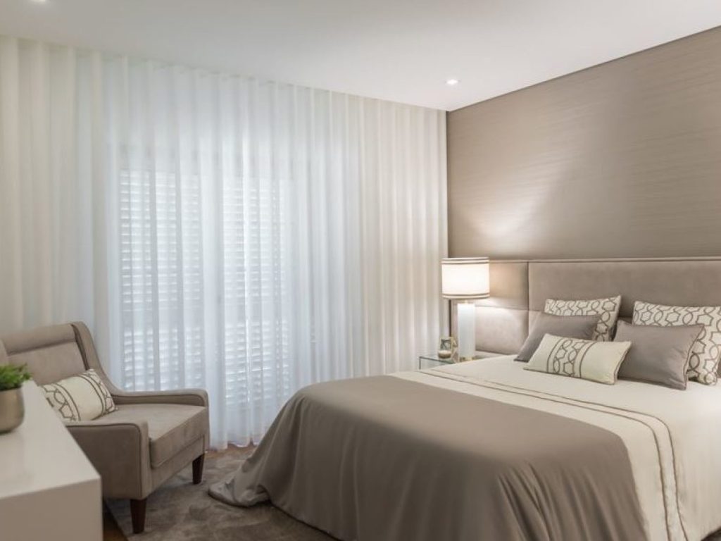 quarto neutro com cortinas brancas
