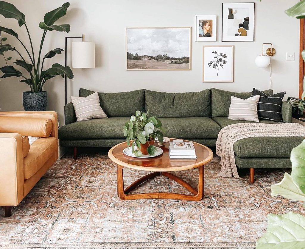 Agora, se quiser dar mais destaque pro tapete (ou disfarçar aquele sofá que você já enjoou), pode escolher uma cor que contraste, mas que ainda converse com o resto da decoração.