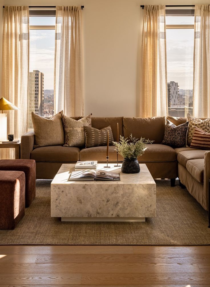 Se você gosta de um visual mais clássico e suave, o tapete pode seguir a mesma paleta do sofá — tons próximos criam um efeito monocromático elegante.