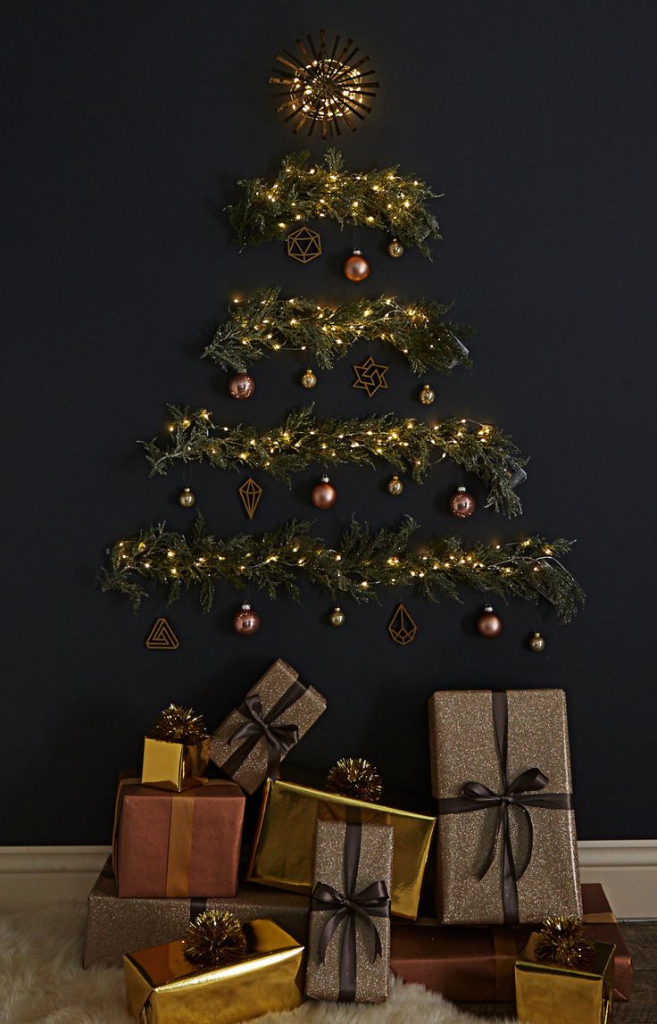 Galhos verdes podem ser dispostos horizontalmente na parede, formando camadas que vão do menor para o maior, criando o efeito de uma árvore de Natal.