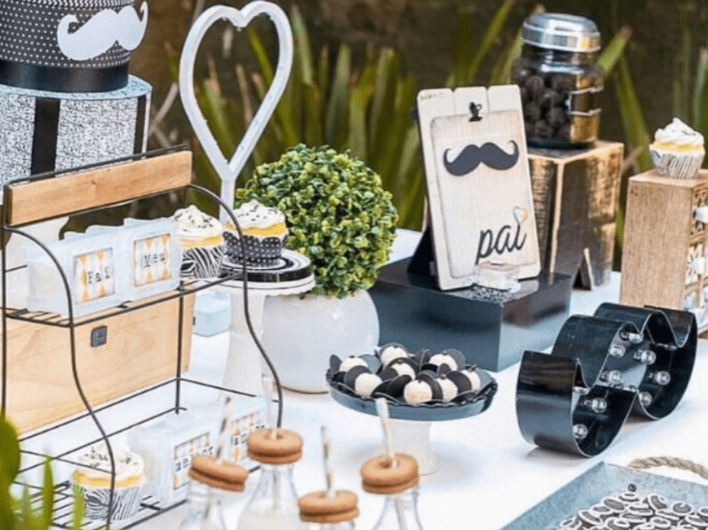 Por fim, há itens clássicos que remetem aos pais, como uma decoração com gravatas de papel ou de tecido, bem como bigodes feitos em papel ou plástico.