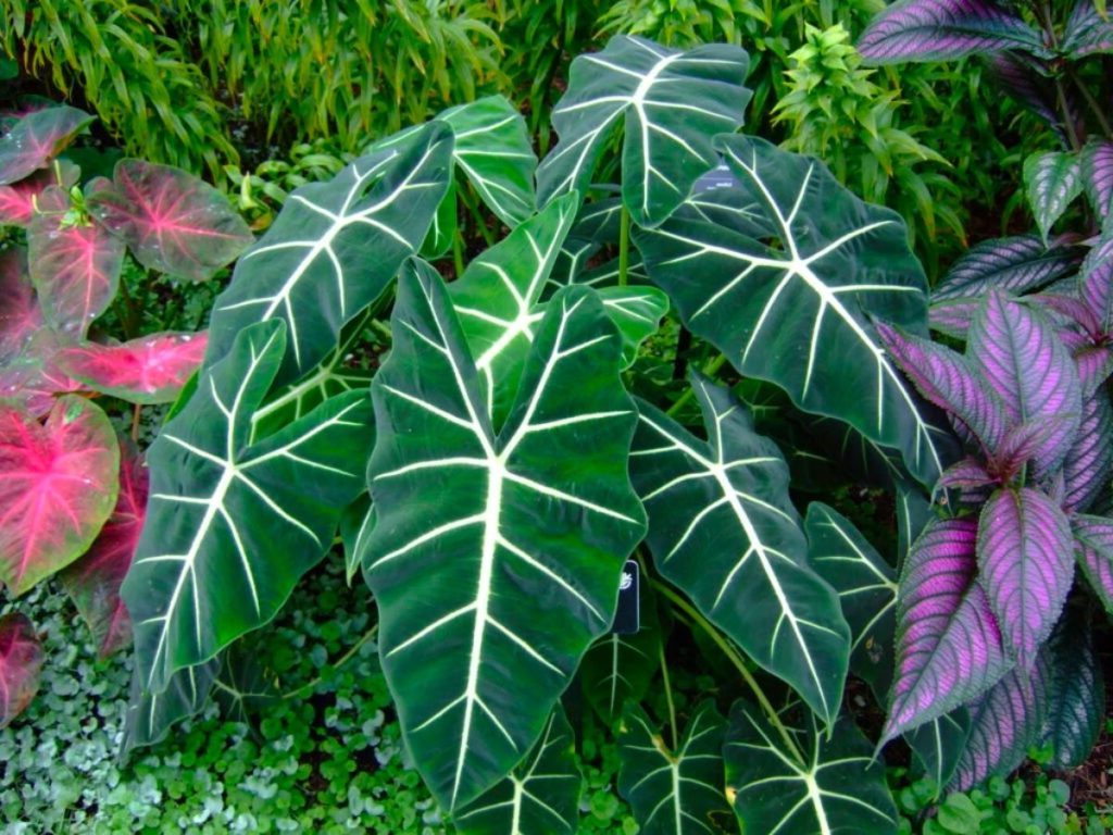 A alocásia é uma planta tropical com folhas de tonalidade verde-escura e nervuras claras. São serrilhadas e, dependendo do tipo, podem ter folha verde-púrpura.