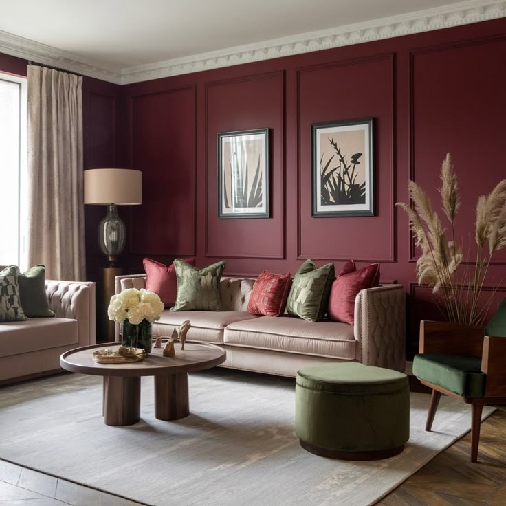 Marcante, o marsala aquece e dá profundidade ao ambiente. É uma escolha clássica para elementos de destaque, como paredes ou sofás.