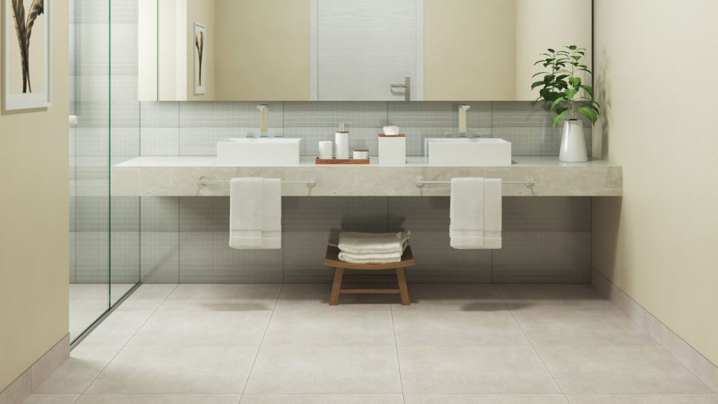 Então, dê toques de cor com outros tons em detalhes específicos do banheiro. Você pode, por exemplo, escolher um gabinete de madeira natural, inserindo tons terrosos no espaço.