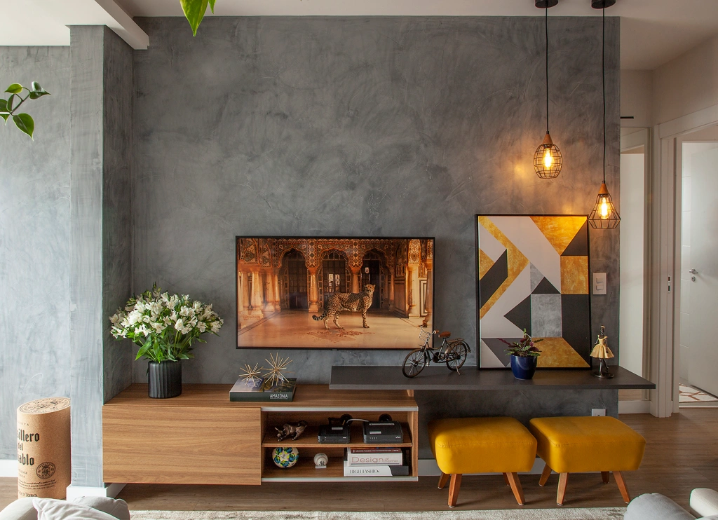 Com a madeira, o cimento queimado deixa um cômodo com um visual aconchegante e atual ao mesmo tempo.