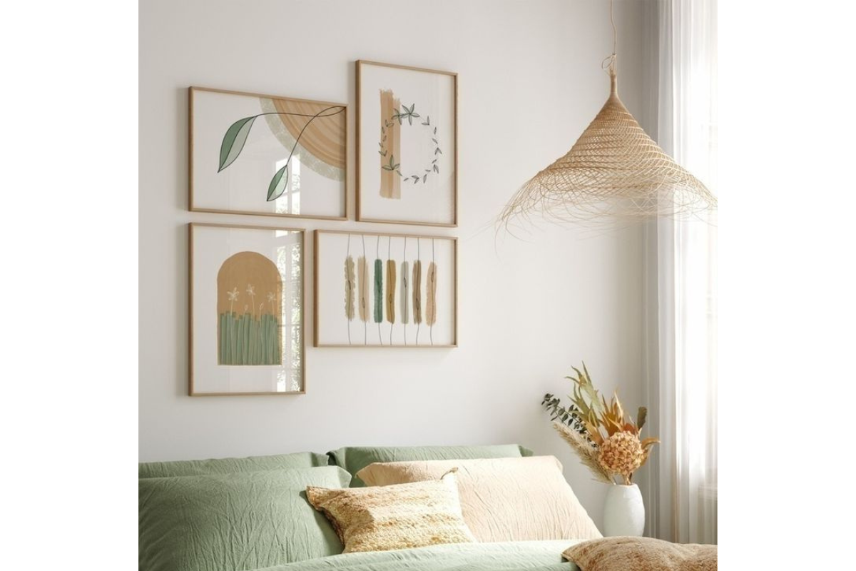 A arte abstrata é uma escolha popular para quem busca um visual contemporâneo, enquanto fotos pessoais ou ilustrações podem adicionar um toque mais pessoal ao espaço.