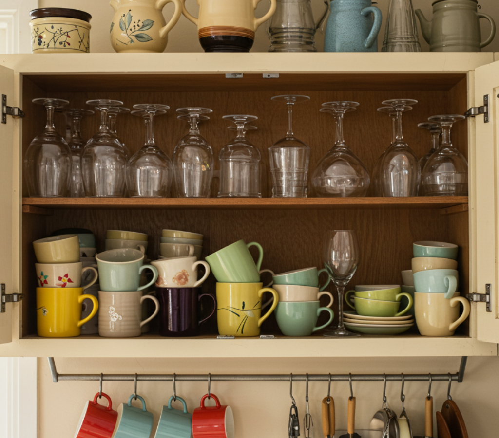 Empilhar xícaras, copos e utensílios diretamente uns sobre os outros é um erro comum que aumenta o risco de quebras no armário suspenso da cozinha.