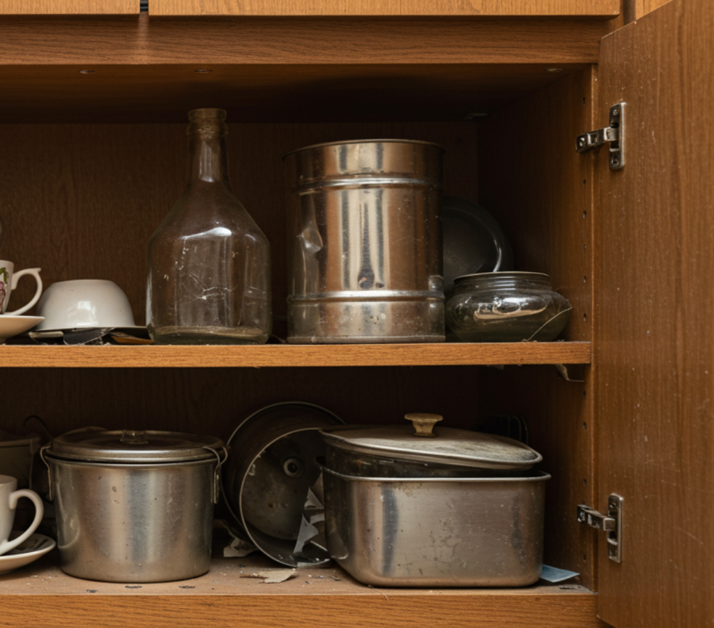 1. Empilhar utensílios e xícaras de forma inadequada ao organizar o armário da cozinha