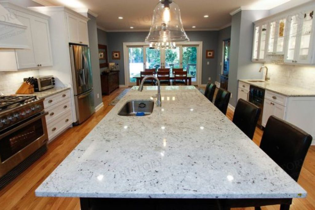 Esse granito também pode ser usado como forma de integrar ambientes, conforme você pode ver na imagem inspiração, onde a cozinha se conecta com a sala de jantar e a área de estar.