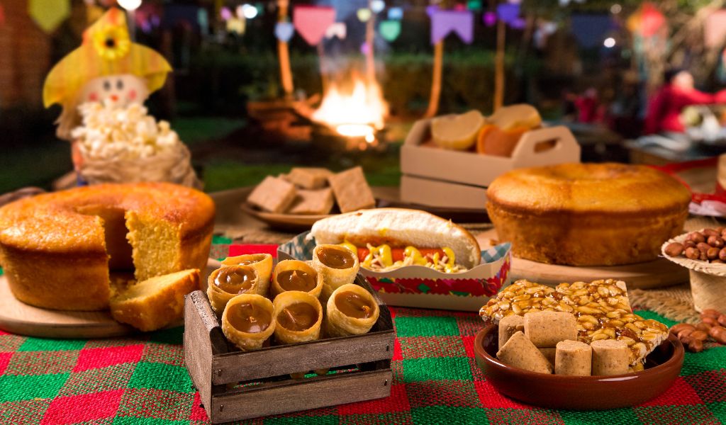 Aposte em doces típicos, como pé de moleque, paçoca, canjica e pipoca em potes decorativos.