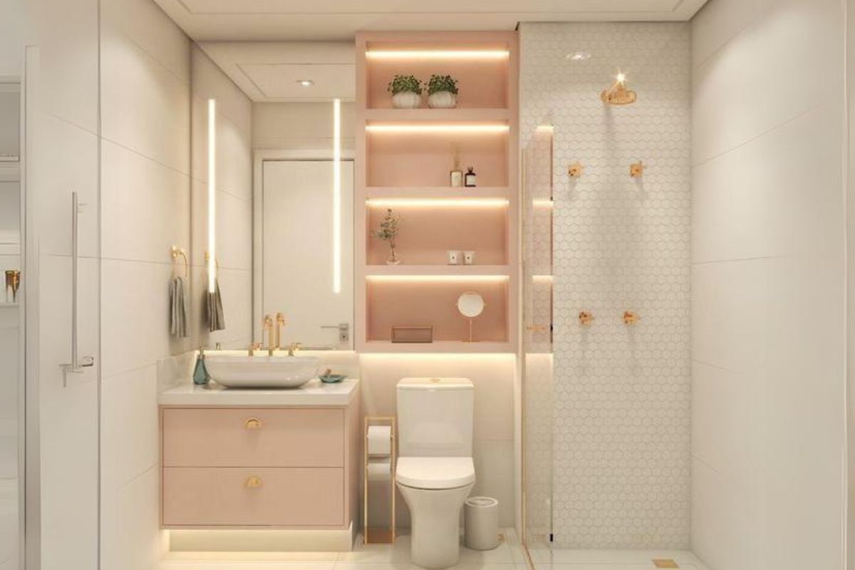 Troque por iluminação nas laterais, instalando arandelas ou fitas de LED. Isso garante uma luz mais natural e funcional para o banheiro e evita que ele pareça antigo.