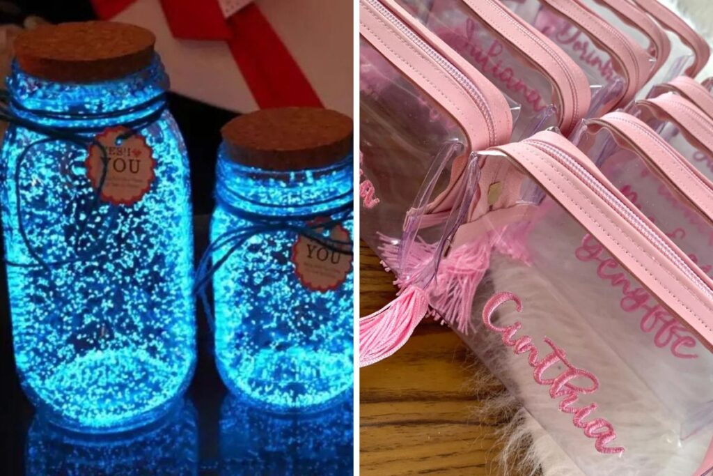 Outra ideia de lembrancinha de 15 anos são os itens personalizados. As necessaires personalizadas, por exemplo, são lembranças práticas e lindas.