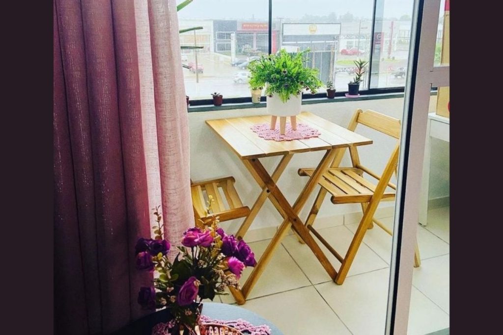 Para varandas menores, os móveis dobráveis de madeira oferecem flexibilidade e praticidade.