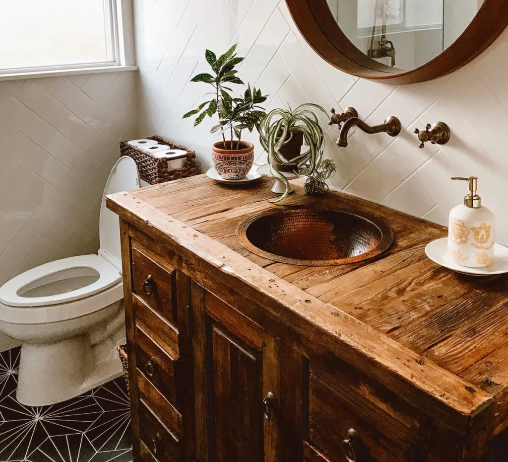 O acabamento de madeira, que pode estar presente somente nas laterais ou nas bordas frontais dos móveis, tem tudo para dar um toque final e, só com isso, fazer a aparência do banheiro fugir do comum.