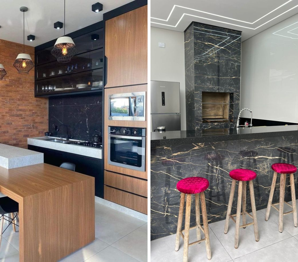 Ambos os materiais são resistentes a altas temperaturas, manchas, riscos e outros impactos. Além disso, também podem acabar usados tanto nas paredes quanto como revestimento para bancada da área gourmet.