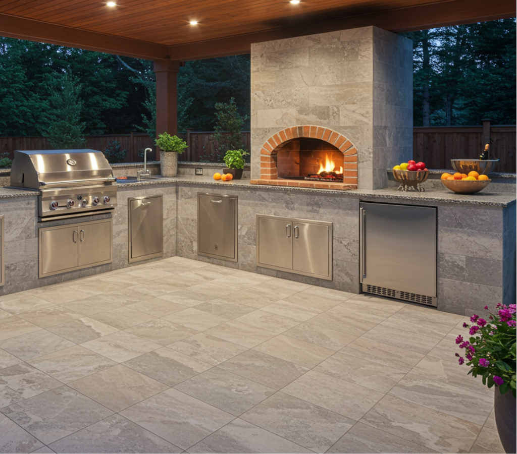 O primeiro deles é o porcelanato, uma excelente opção para áreas cobertas e internas, segundo os designers. Esse material é conhecido pela sua durabilidade e resistência às altas temperaturas.