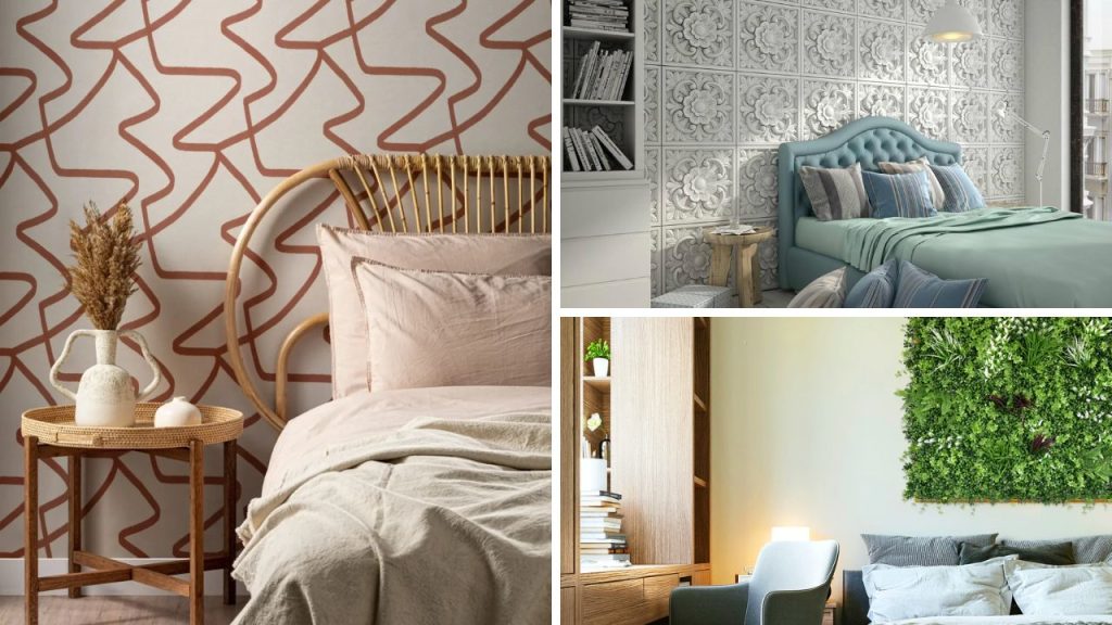 Já quartos amplos podem brincar com materiais e cores para criar contrastes e pontos de atenção. A iluminação também é essencial para valorizar qualquer tipo de parede decorativa.
