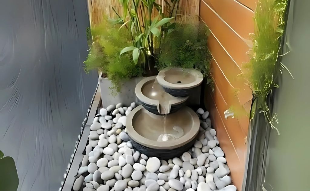 Combine pedras brancas decorativas com cascatas e fontes de água