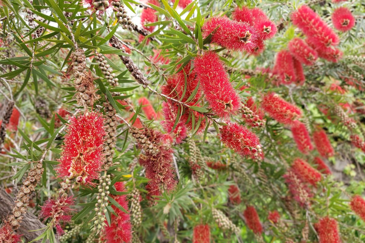 Popularmente conhecido como “escova-de-garrafa” devido à forma de suas flores, o calistemo é uma planta que atrai uma variedade de aves, especialmente os beija-flores.