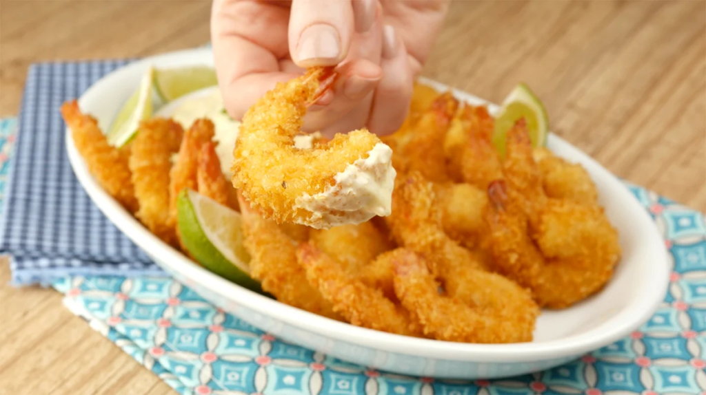 - Mergulhe cada camarão na mistura de farinha de rosca.