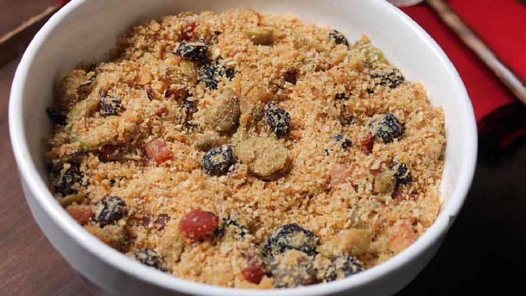 A textura crocante da farofa de mandioca se une ao doce e suave sabor dos damascos e ameixas.