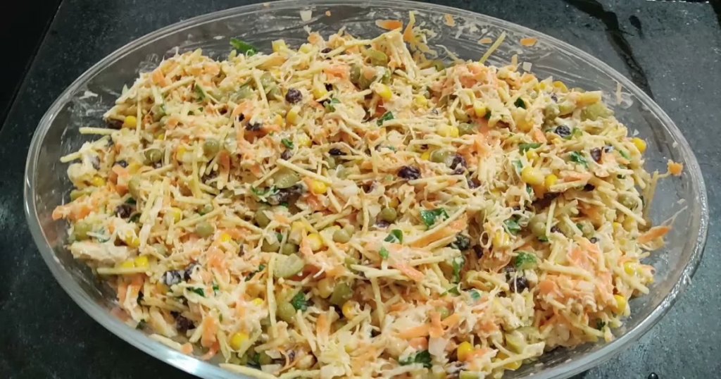 Continuando, o salpicão também combina com saladas, ainda mais se você gosta de alimentos mais saudáveis. Você pode deixar o prato mais rico em nutrientes e escolher quaisquer vegetais e frutas para aprimorá-lo.