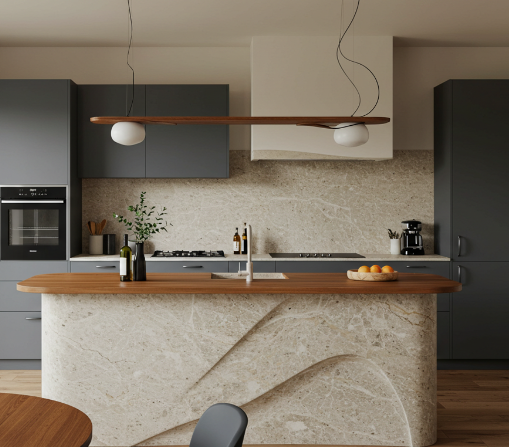 Além dos tons terrosos e madeiras, há valorização de linhas orgânicas nos móveis e bancadas — curvas suaves no lugar de cantos retos trazem mais conforto visual e físico, principalmente em espaços pequenos.