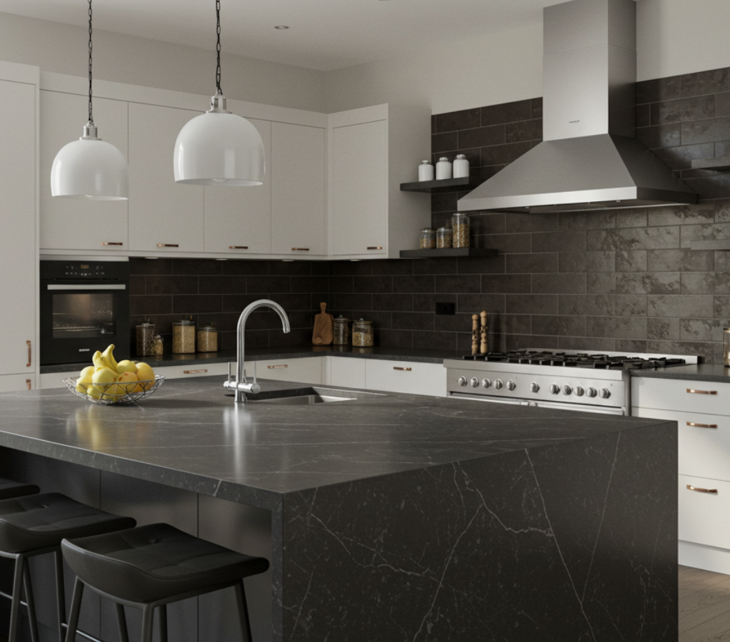 Ambos oferecem elegância e resistência, além de permitirem aplicação contínua em pisos, bancadas e paredes, o que ajuda a ampliar visualmente o espaço.