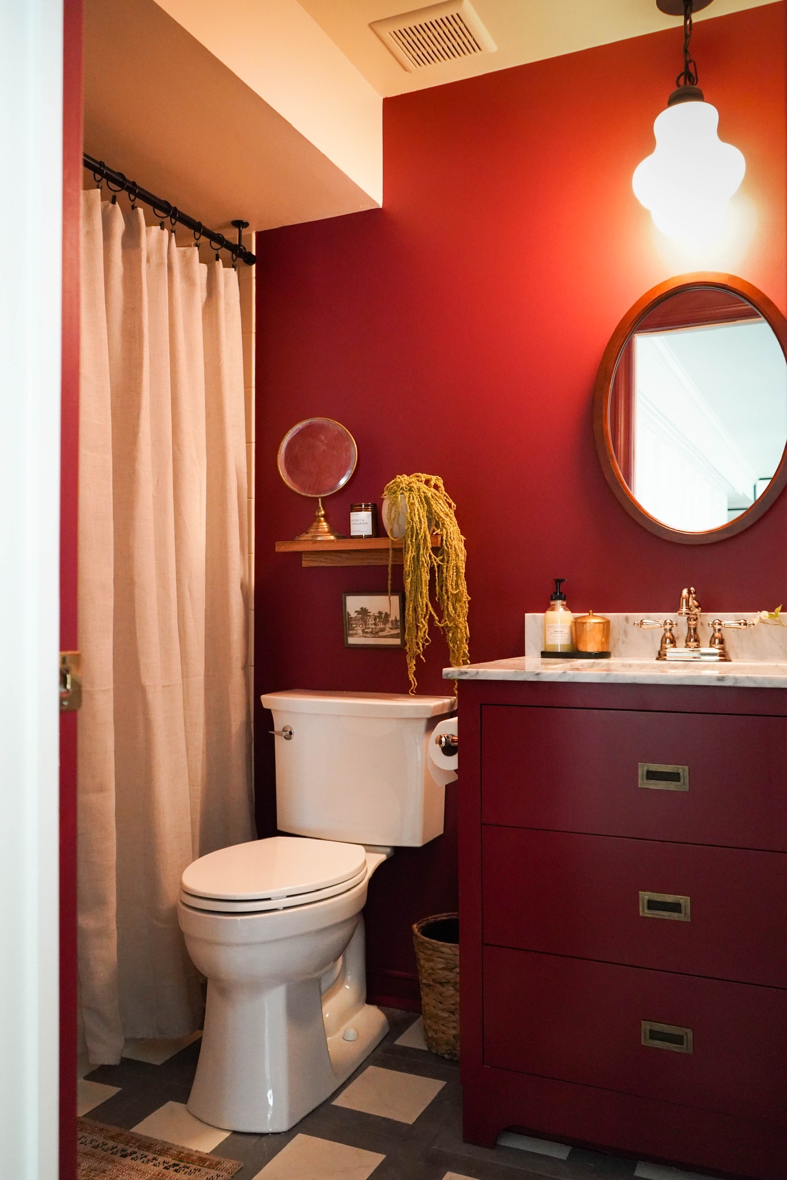 banheiro em tom vermelho-escuro