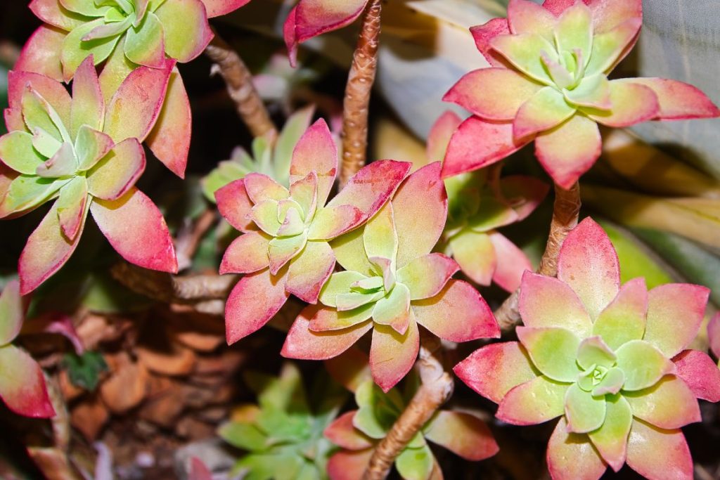 Suas folhas, dependendo da variedade, podem apresentar cores que variam do verde ao preto, passando por tons de vermelho e amarelo. Para um crescimento saudável, os Aeoniums requerem regas regulares durante os meses mais quentes e uma redução no inverno.